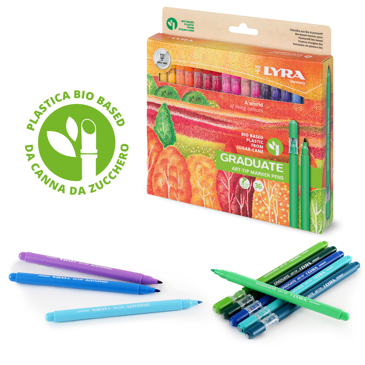 Ideale per tutte le tecniche di coloritura, hand lettering, bullet journal, manga, è pensato per studenti, artisti e appassionati di disegno. LYRA Graduate Art Tip è disponibile in confezioni di cartone riciclato nei formati con 12, 24 o 36 colori intensi e brillanti.