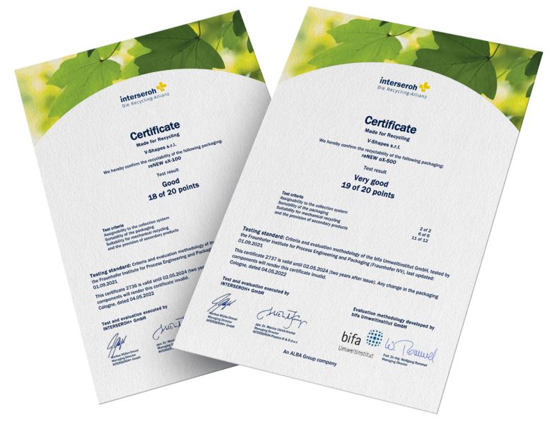 Si parla di due nuovi substrati chiamati reNEW oX-100 e reNEW oX-500 e progettati da V-Shapes e costituiti da un unico foglio di copolimeri di polipropilene con elevate capacità barriera. Sono stati studiati per essere correttamente rilevati, smistati e riciclati nel flusso dei rifiuti industriali. Interseroh ha infatti classificato questi due tipi di laminati nella fascia alta della scala in termini di idoneità al riciclaggio meccanico e all’utilizzo come prodotti secondari.